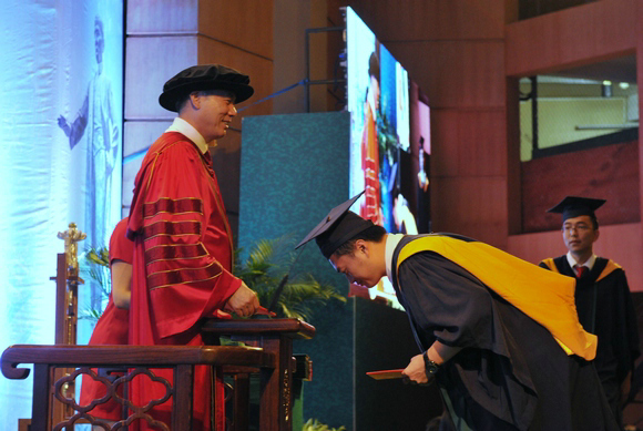 时间定格于7月7日,这一天毕业季的浓郁气息弥漫在校园里的每个角落,染红了傍晚的夕阳,惊醒了大树上的知了,也沉醉了中央大草坪前的每张笑脸。梁銶琚堂内,2015届毕业典礼暨2015年学位授予仪式即将落下帷幕。在这短暂而又漫长的四天里,14073名毕业生在神圣权杖的见证下,逐一走上主礼台与罗俊校长握手,接过毕业纪念册,正式完成了从学生到校友的转换。红砖绿瓦间留下白衬衫红领带的身影,感激与欢呼,深情与不舍,都凝聚在一张张笑脸上,镜头定格,美好的时光将永久镌刻于每位毕业生的记忆深处。