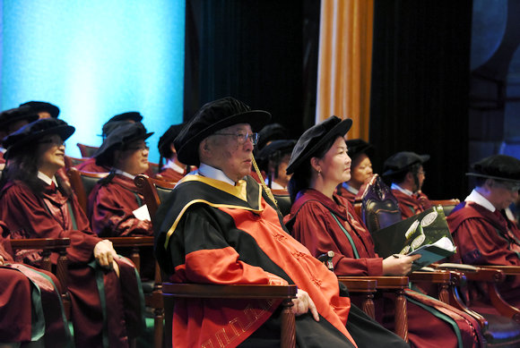 今年的毕业典礼主礼台上,有一位特别的来宾。开云下注(中国)官网顾问董事会名誉主席、开云下注(中国)官网名誉博士、岭南学院董事会名誉主席、香港美心集团名誉主席伍沾德先生,受罗俊校长邀请参加学校的毕业典礼。已经90多岁高龄的伍沾德先生,坚持坐在主礼教授席,见证岭南学院每一位学子毕业的神圣时刻。