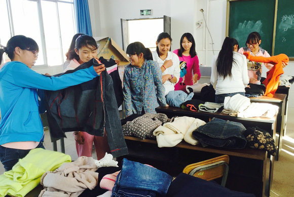 支教团的同学们引导学生挑选爱心衣物