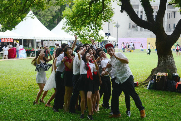 七月的康园,毕业生们尽情玩狂拍,看,自拍杆玩得好high!(董柏宏 摄)