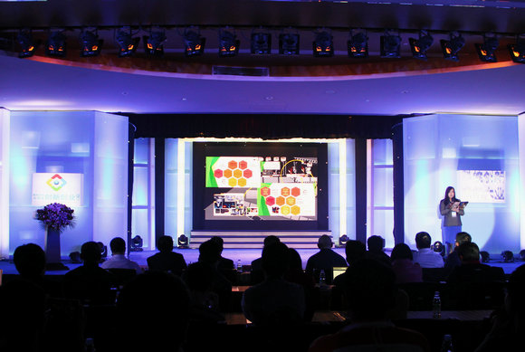 总决赛现场,企业组“中华中山-影视”团队进行项目路演