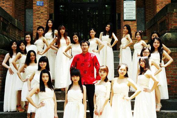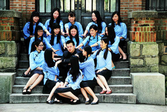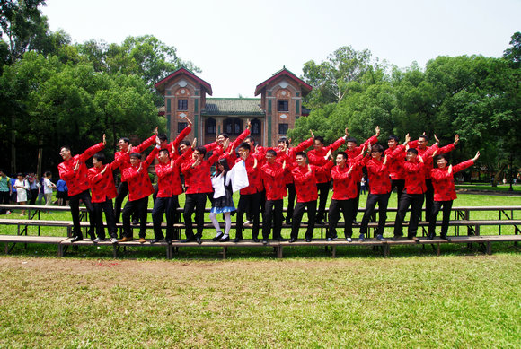 2010级软件学院电子政务班的同学则用“中西结合”的方式在东校区和南校区留下纪念。在东校区,他们用黑色长袍吟咏出毕业骊歌,用白色衬衣、红色领带致意青葱岁月。在南校区,他们用白色礼服和红色唐装画出另一道亮丽的风景线。“虽然软件学院一向是‘阳盛阴衰’,但是我们班却是女生比较多,所以我们才选择了礼服,给我们班的男生长长脸。”提起挑选这两套服装的过程,电子政务班的班长刘名越同学笑得十分开心,“因为没有挑到与礼服相配的男生服装,我们索性就选了非常喜庆的唐装”。怀士堂前,身着红色唐装的男生们拱手作揖,为离别的校园增添热闹的笑颜。格兰堂前,身着白色礼服的女生围成爱心,一个身穿红色唐装的男生“傲然”其中,“万花从中一点红”,羡煞旁人。