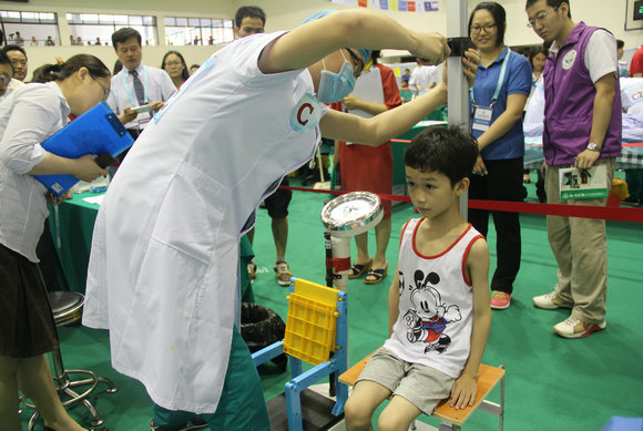 竞赛现场小朋友被邀请作为“标准化病人”配合医学生们做体检检查