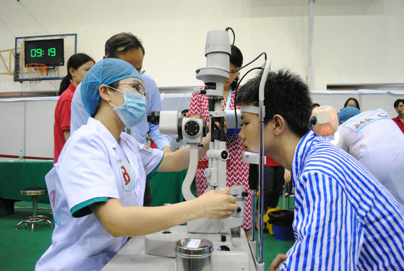 成人“标准化病人”正在接受眼科检查