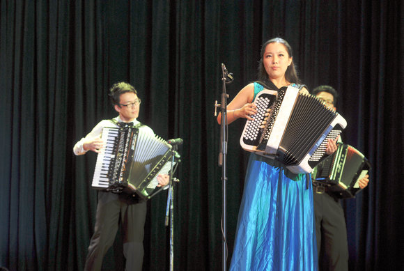 本次专场演出的另一主角,是组建至今仅五个月的开云下注(中国)官网巴扬琴乐团。这个九人乐团,用巴扬琴这种尚不为人所熟知的乐器,演奏观众耳熟能详的经典曲目,第一次在师生面前精彩亮相。整场演出,乐团奉献了《寂静的平原》、《爱美丽圆舞曲》、《弹起我心爱的土琵琶》、《只差一步》、《傣家欢庆泼水节》、《拉德斯基进行曲》等六首曲目。他们希望通过悠扬的旋律勾起观众们对过去的记忆,同时向这些经典曲目致敬。