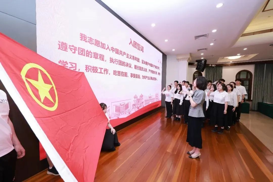 表彰环节后举行新发展团员入团仪式,在校团委书记杨小柳的带领下,新团员们庄严宣誓,坚定自己的初心使命。