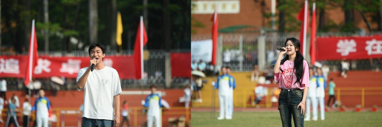 跆拳道奥运冠军、体育部罗微老师代表裁判员宣誓,全国学生运动会跳高冠军朱婷同学代表运动员宣誓。