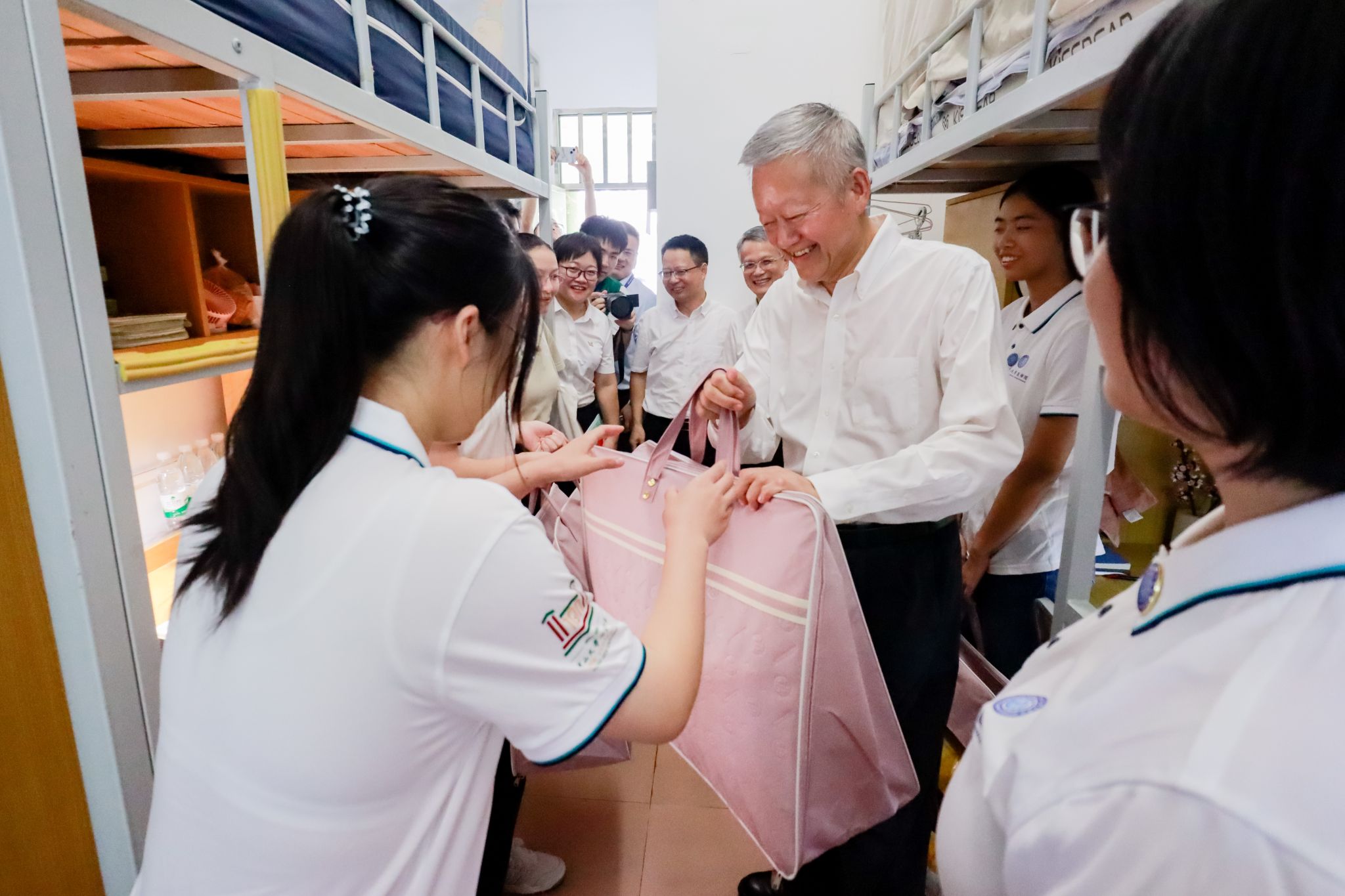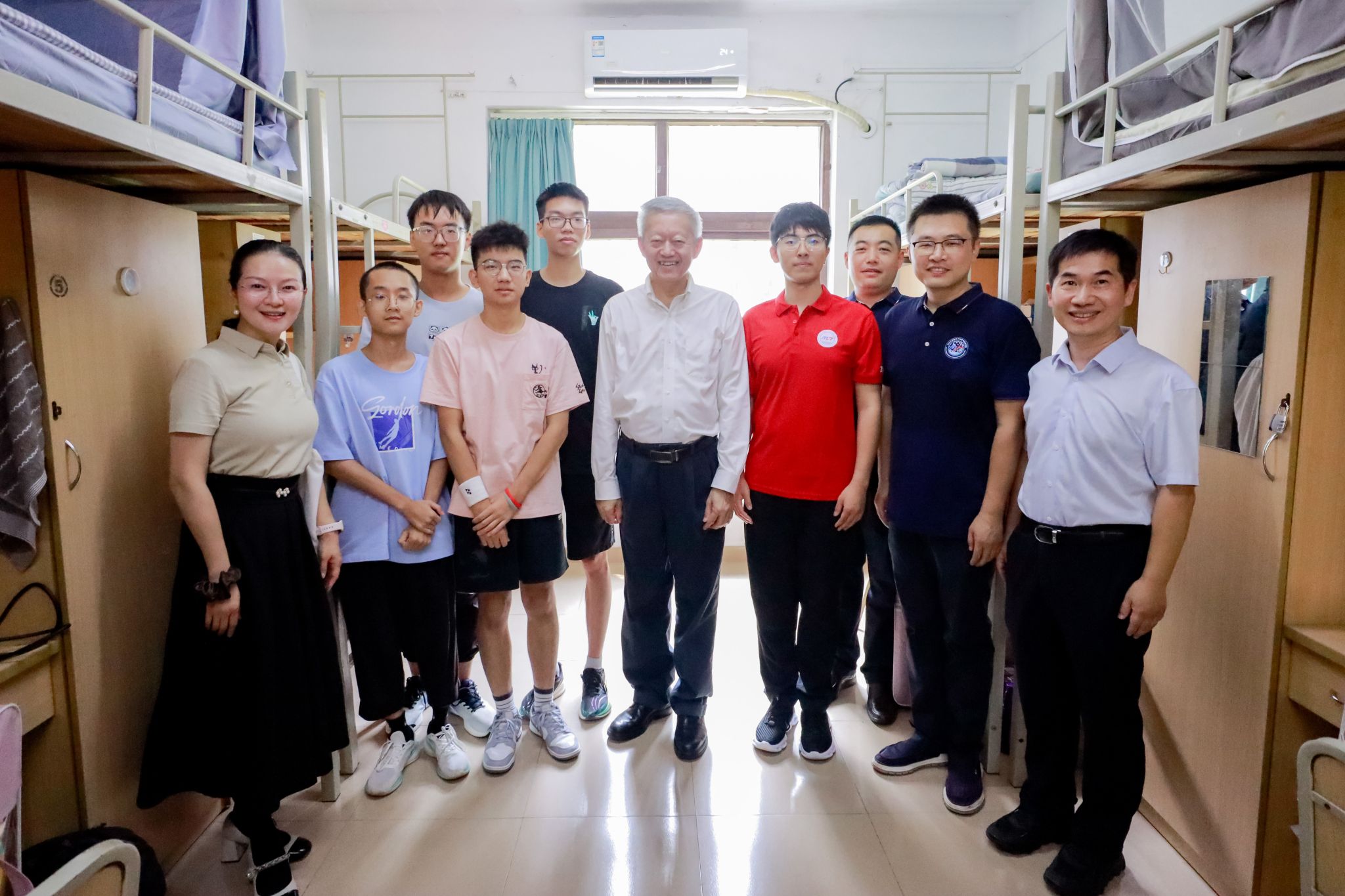 校领导与新生在寝室合影留念