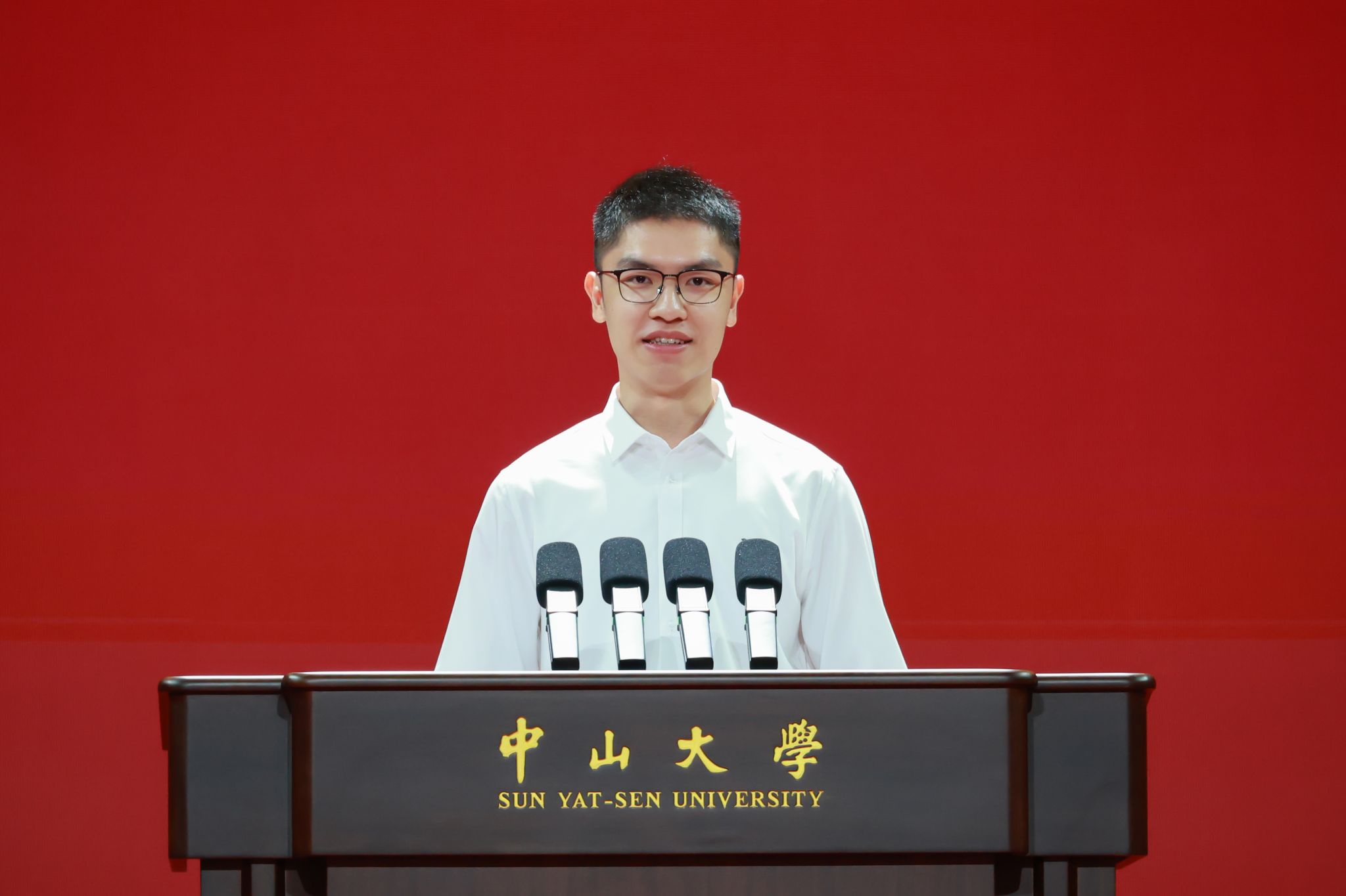 学生代表、政治与公共事务管理学院2024级硕士研究生钟睿祺同学发言。他表示,世纪中大给予青年学子报国志向和追梦力量、指引学子逐浪潮头。作为中大学子,将牢记习近平总书记嘱托,站在服务国家高质量发展和高水平科技自立自强的新起点,立志为中国式现代化贡献中大力量;把论文写在祖国大地,在民族复兴伟业中展现青春作为、彰显青春风采、贡献青春力量。