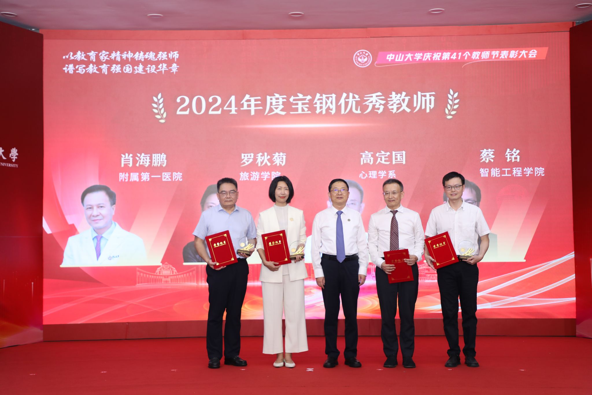 旅游学院保继刚教授荣获“2024年国家级教学名师”称号。附属第一医院肖海鹏教授、旅游学院罗秋菊教授、心理学系高定国教授、智能工程学院蔡铭教授荣获“2024年度宝钢优秀教师”称号。此外,高定国教授还荣获第十九届霍英东教育基金会高等院校教育教学奖。