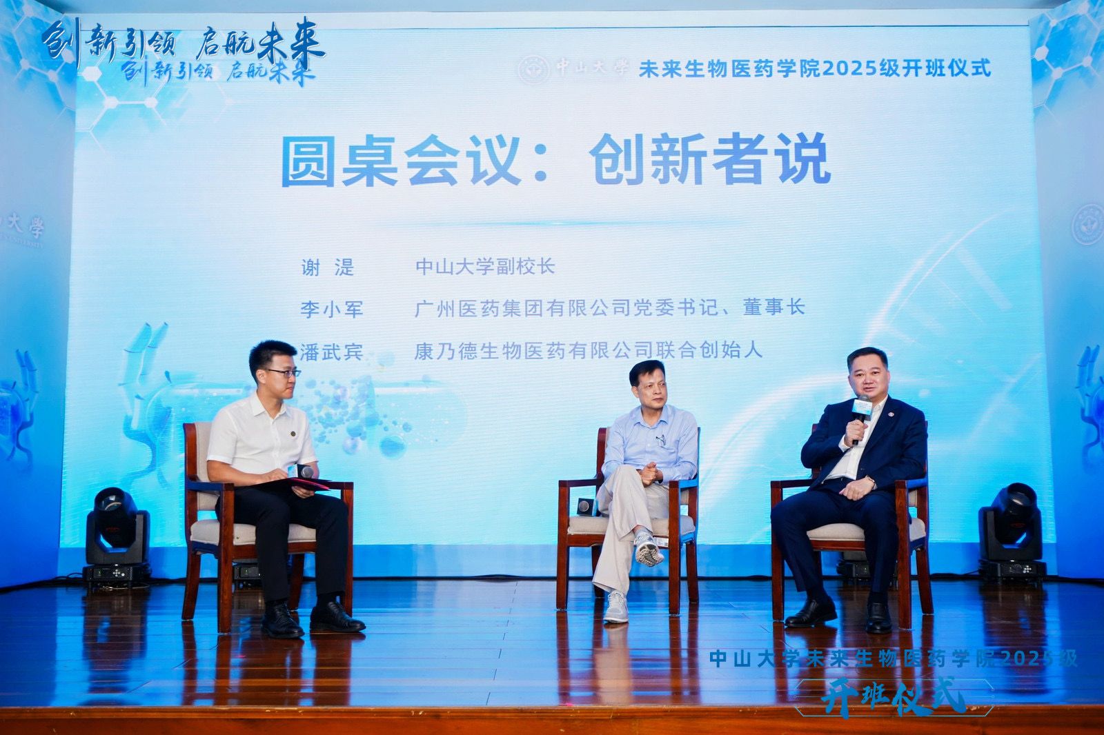 在“创新者说”环节,谢湜与李小军、潘武宾围绕“生物医药领域创新与人才培养”展开深度访谈。李小军结合广药集团的发展实践,深入分析了创新药物研发面临的挑战与机遇;潘武宾则从自身科研经历出发,勉励同学们牢记创新意识,深耕创新药物研发领域。