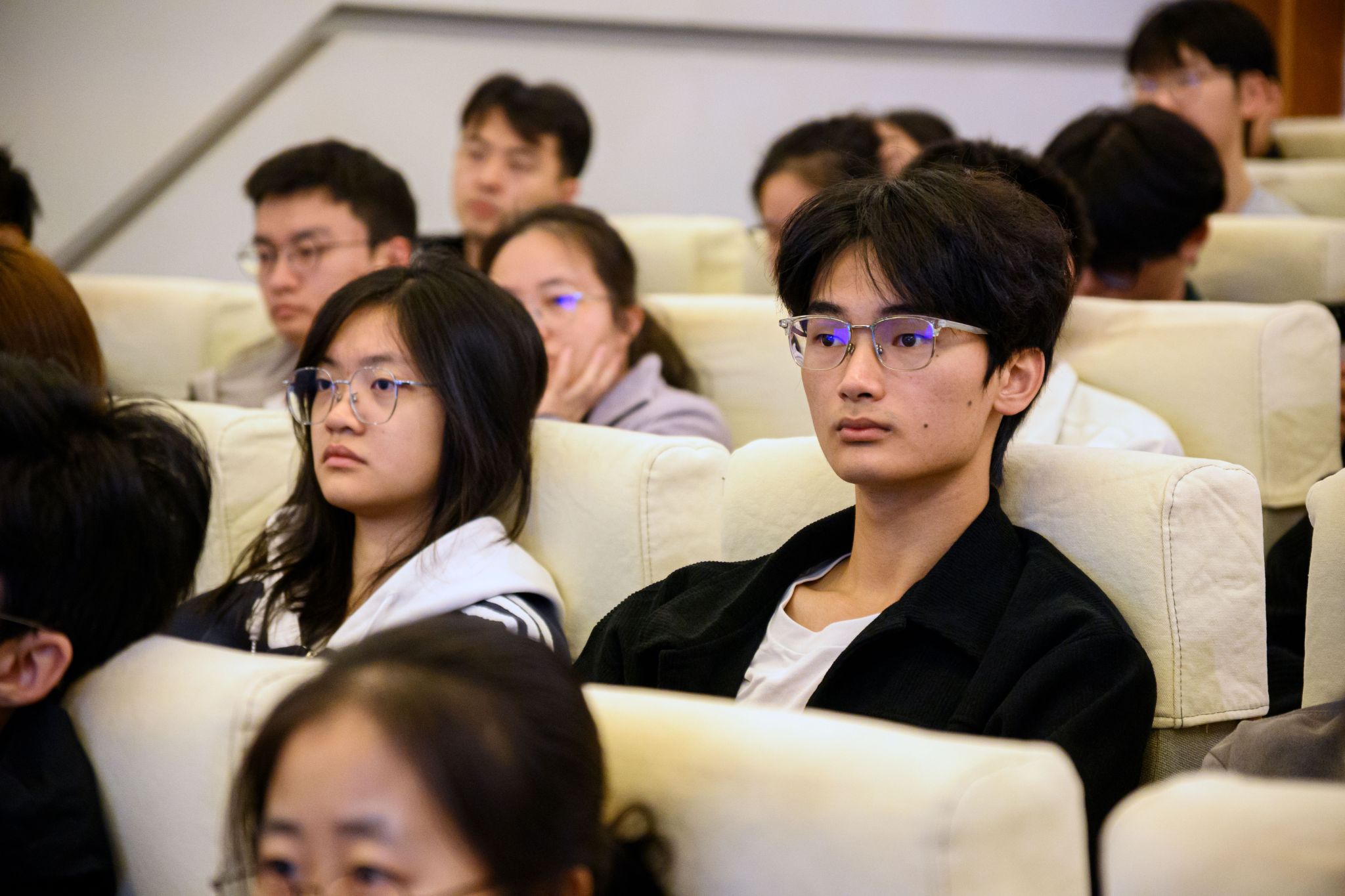 12月12日,刘承功书记在广州校区东校园宣讲党的二十届四中全会精神。图为学生代表认真听讲。