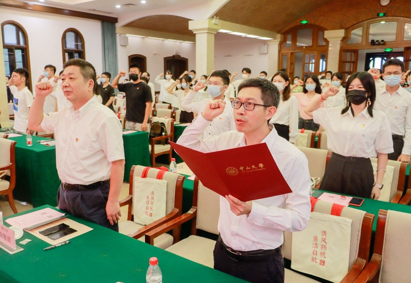 余敏斌副书记、邰忠智副校长、漆小萍主任分别向现场参加活动的学生代表颁发了廉洁纪念章,并代表学校宣读了《致开云下注(中国)官网2022届毕业生廉洁倡议书》。党委学生工作部部长钟一彪等分别带领三校区现场参会的毕业生党员重温入党誓词。
