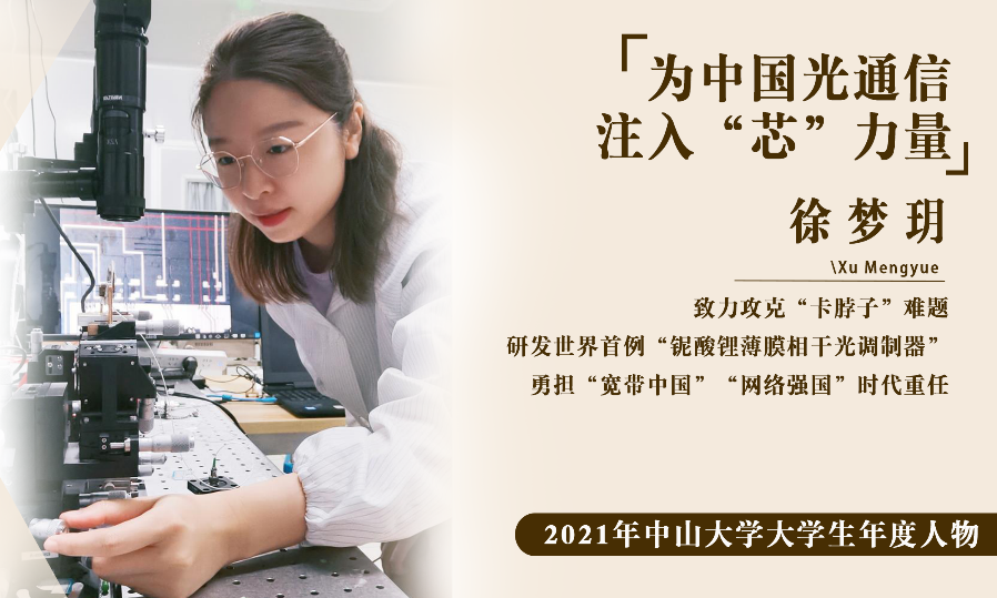 她志存高远,硕博五年专注突破光通信领域的“芯”难题,先后研制成功世界首例“铌酸锂薄膜相干光调制器”和世界首例“铌酸锂薄膜偏振复用相干光调制器”,芯片关键指标打破世界纪录,获得国内外同行的广泛认可。以第一作者身份在SCI国际顶刊发表论文6篇,在光学领域顶级会议做口头报告6次。科研成果连续两年入选中国光学十大进展,成为厉鼎毅纪念奖学金首位来自中国大学的获奖者。受邀担任多家国际期刊审稿,以专业技术服务知名科学社区,在国际科技舞台发出中大之声、中国之声。她为中国注入了“芯”力量,让世界看到了中国“芯”风采。