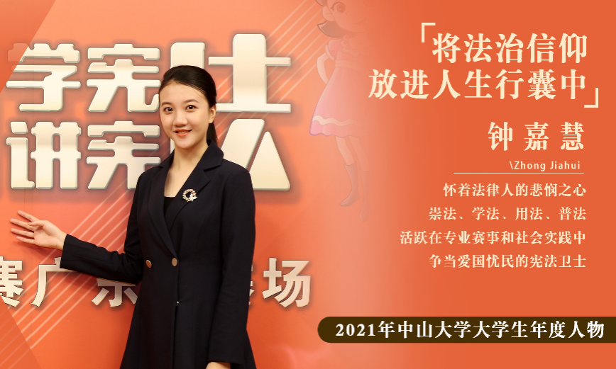 践行“明德笃志,崇法守正”,争当宪法卫士。2021年12月,她作为广东省唯一高校学生代表参赛,荣获第六届全国学生“学宪法 讲宪法”全国总决赛高校组冠军,并受邀参加2021年国家宪法日教育系统“宪法晨读”活动,进行演讲展演。怀着法律人的悲悯之心和同理心,关切社会现实,传达法律温度。她以《宪法守护最美夕阳红》为题呼吁关注老人群体面临的数字鸿沟问题;以“一身戎装护平安”为题讲述我国军人忠诚戍边的动人故事;参加第十七届“挑战杯”学术竞赛,从法律角度分析直播带货中的消费者维权困境并撰写调研报告。她将法治精神内化于心、外化于行,源源不断地释放正能量。