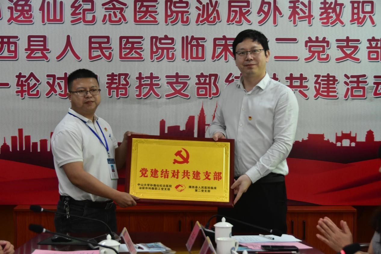 为发挥党建引领作用和支部示范作用,7月13日下午,教育部第三批全国党建工作示范样板支部培训创建单位——孙逸仙纪念医院泌尿外科教职工党支部和揭西县人民医院临床第二党支部举行了“党建结对共建支部”授牌仪式。支部书记黄海教授总结了过去几年的帮扶成效,并介绍了下一步党支部共建的思路和帮扶计划。双方与会党员开展了交流。
