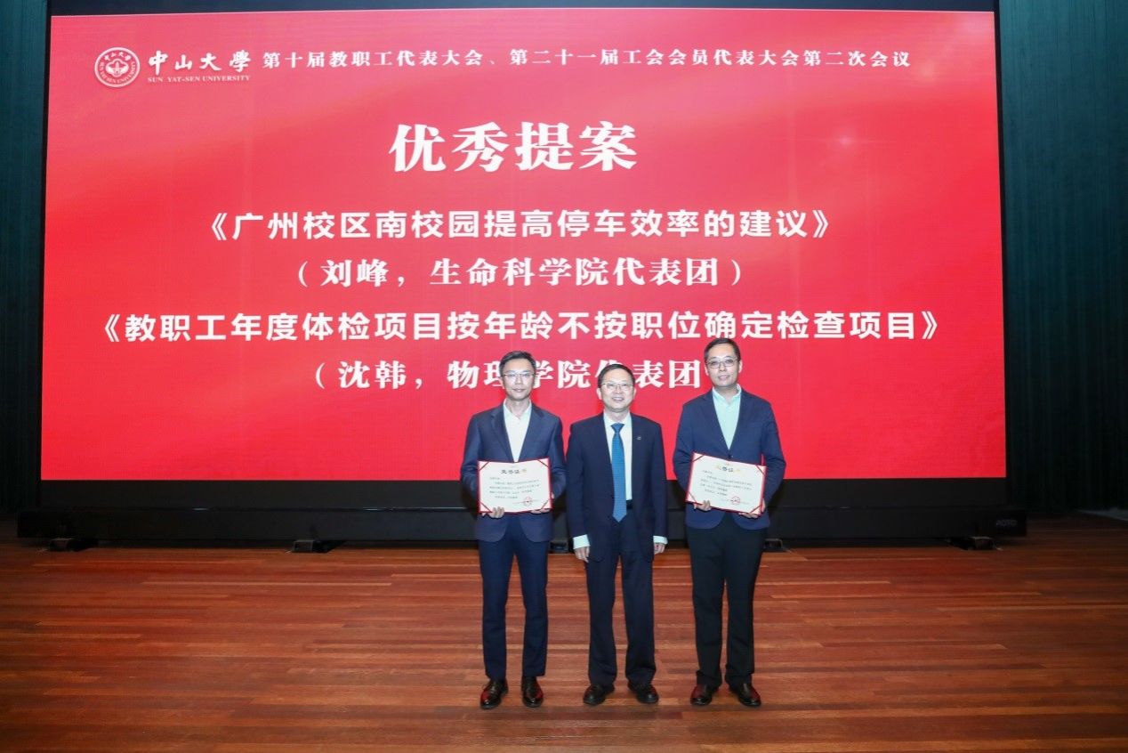高松校长为荣获十届一次教代会“优秀提案”的生命科学学院刘峰代表(右)、物理学院沈韩代表(左)颁发证书(来源:校工会)