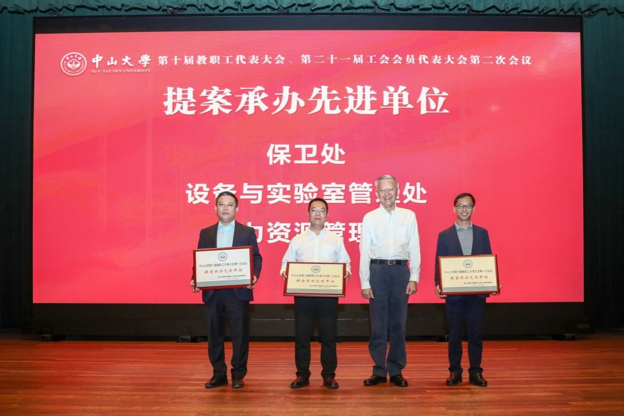 陈春声书记为荣获十届一次教代会“提案承办先进单位”称号的保卫处、设备与实验室管理处和人力资源管理处代表颁发奖牌(来源:校工会)