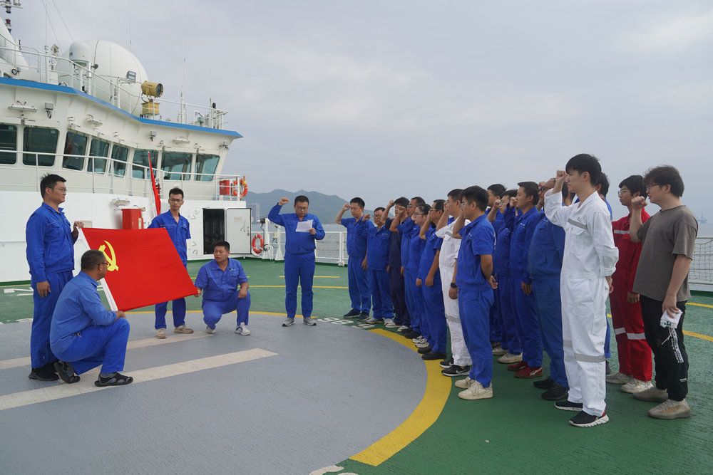 在避风的空闲时间中,船员和甲方积极组织开展党支部共建活动,双方互相介绍发展历程,增进融合互信;通过学习习近平总书记关于海洋强国的系列讲话,双方更加坚定了用行动奋进新时代的决心,为祖国的海洋事业贡献自己的力量。会后,双方党员和入党积极分子在直升机甲板重温了入党誓词。