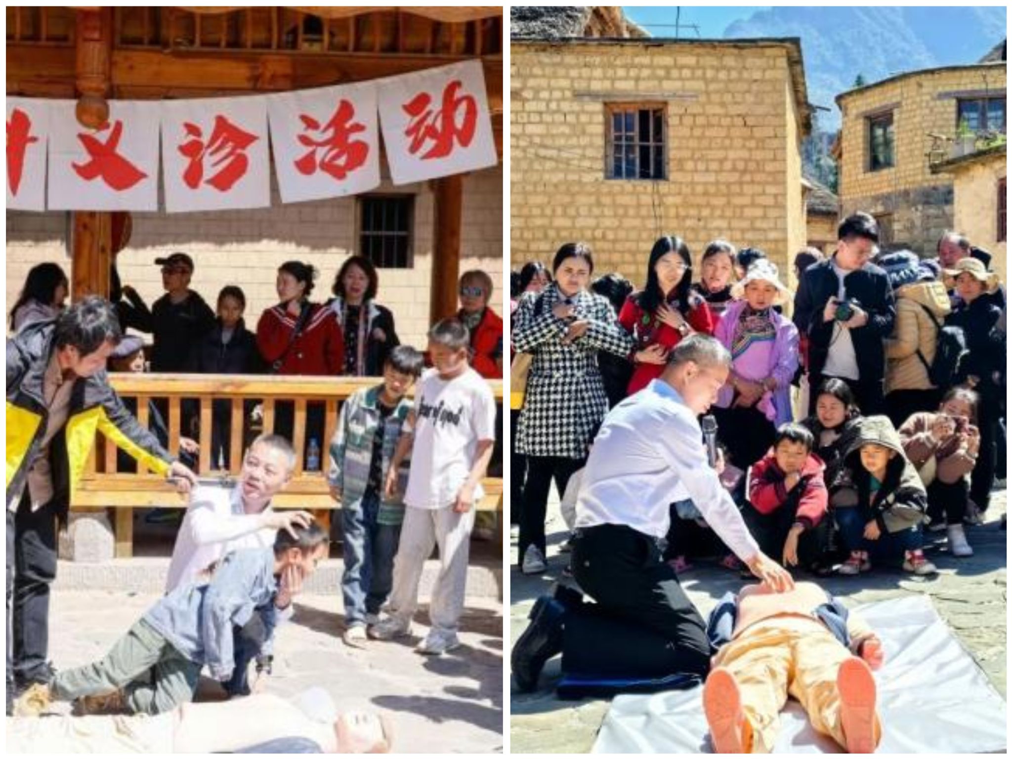 午后,刘江辉副教授面向村民和游客上了一堂生动的急救培训课。“这样双手交叉,用力按压,知道要按照什么节奏按压吗?《最炫民族风》!”他的一番话逗乐了在场的村民。他解释道,一分钟按压100到120次最合适,《最炫民族风》的节奏是一分钟114下。