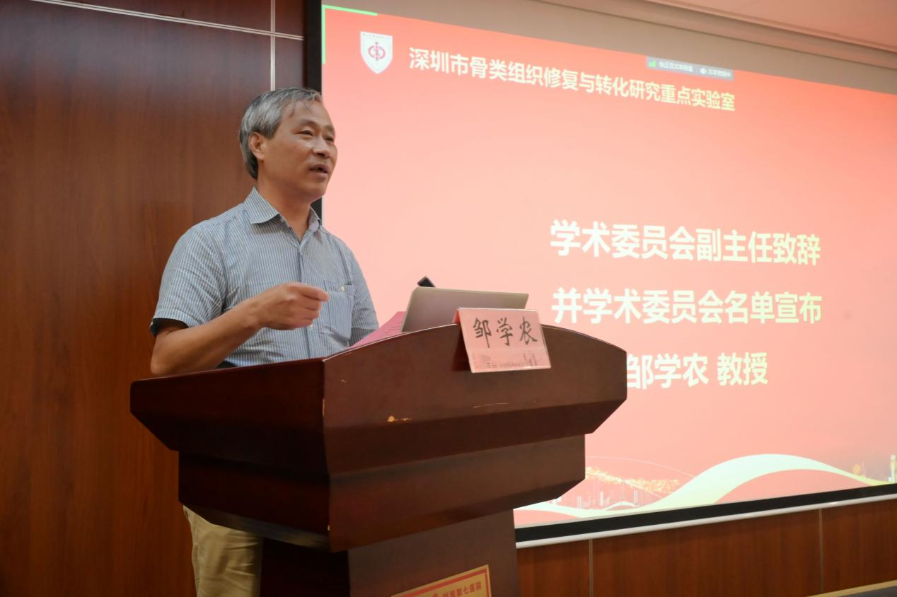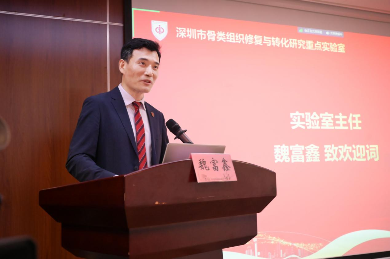 深圳市科创局实验室与科研机构管理处副处长詹迪深,广东省骨科学重点实验室主任、开云下注(中国)官网附属第一医院邹学农教授,中山七院院长何裕隆教授等出席揭牌仪式并致辞。中山七院副院长、骨科重点实验室主任魏富鑫主持会议。