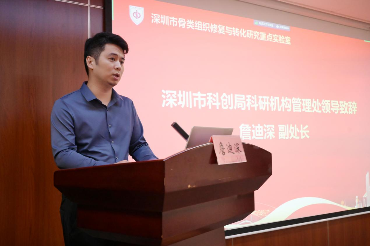 深圳市科创局实验室与科研机构管理处副处长詹迪深向中山七院表达了祝贺。他表示,骨科重点实验室是深圳市科技创新体系的重要组成部分,期待中山七院能够充分利用这一新平台,以提升深圳骨科学术水平和科研能力为主要目标,向广东省重点实验室、国家重点实验室迈进。