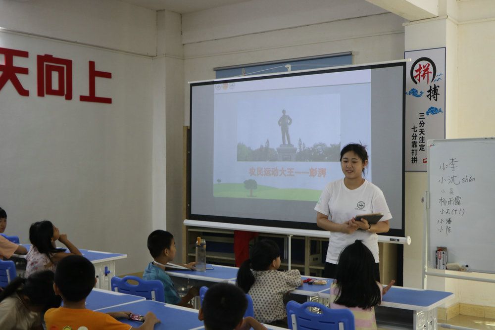 8月24日上午,师生一行来到深汕特别合作区赤石镇圆墩村,走进村里的“四点半”课堂,开展支教活动。支教队员通过播放影像资料、族谱绘制、趣味竞答等方式,讲述了彭湃的革命事迹及其家族一门多烈士的英勇壮举,在小朋友们的心中埋下了一颗红色的种子。