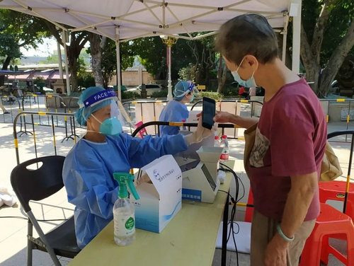 在海珠区这场疫情中,退休致公党党员戴建子奋战在抗疫第一线。作为沙园巾帼艺术志愿服务队的一员,她主要在沙园街道核酸检测点负责引导居民、维持秩序,并且还学会了使用核酸检测扫码录入信息的功能。帮助不懂使用智能手机的长者操作核酸码、为行动不便的长者推轮椅、搀扶腿脚不便的长者完成核酸检测……她将满分的热情投入到每次服务中。