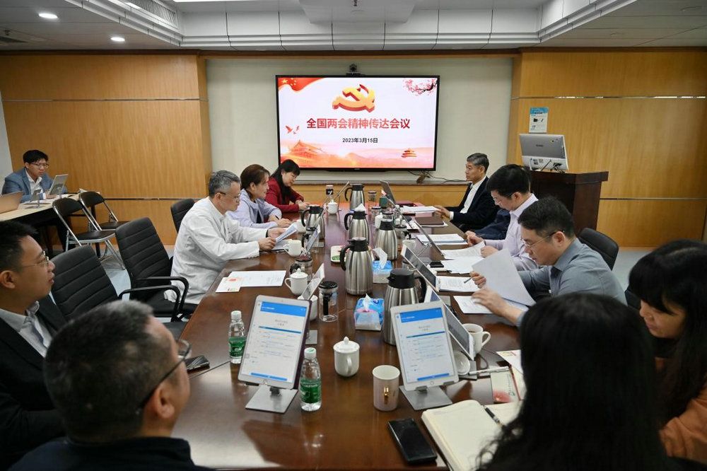 会上,院长宋尔卫院士结合亲身参会履职感悟,传达了十四届全国人大一次会议精神。他表示,这次全国两会是在全面贯彻党的二十大精神的开局之年召开的重要会议,意义重大,影响深远。会议审议通过了政府工作报告等一系列重要文件,选举产生了新一届国家机构和全国政协领导人员。习近平总书记以全票当选国家主席、中央军委主席,充分反映了全党全军全国各族人民的共同心愿,充分展现了我们党和国家强大的凝聚力、向心力。他表示,习近平总书记在参加江苏代表团审议时强调,高质量发展是全面建设社会主义现代化国家的首要任务。面对新形势、新机遇、新目标、新任务,全院干部职工要深入贯彻落实习近平总书记重要讲话精神和全国两会精神,坚持探索高水平研究型医院发展新模式,积极开展世界一流的临床诊疗科技攻关项目,为实现党的二十大确定的目标任务作出新的贡献。