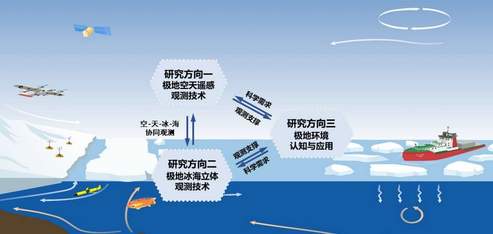 实验室聚焦极地环境快速变化这一国际前沿领域,部署极地空天遥感观测技术、极地海洋立体观测技术、极地环境认知与应用三个重点研究方向,分别由程晓教授(测绘科学与技术学院)、李整林教授(海洋工程与技术学院)、范可教授(大气科学学院)担任学术带头人。在多学科交叉融合基础上,实验室综合发展极地空-天-冰-海立体观测技术,开展极地冰盖物质损耗机制、海冰快速变化机理研究,致力于全面提高对极地环境快速变化机理及其对全球气候变化响应的认知水平。