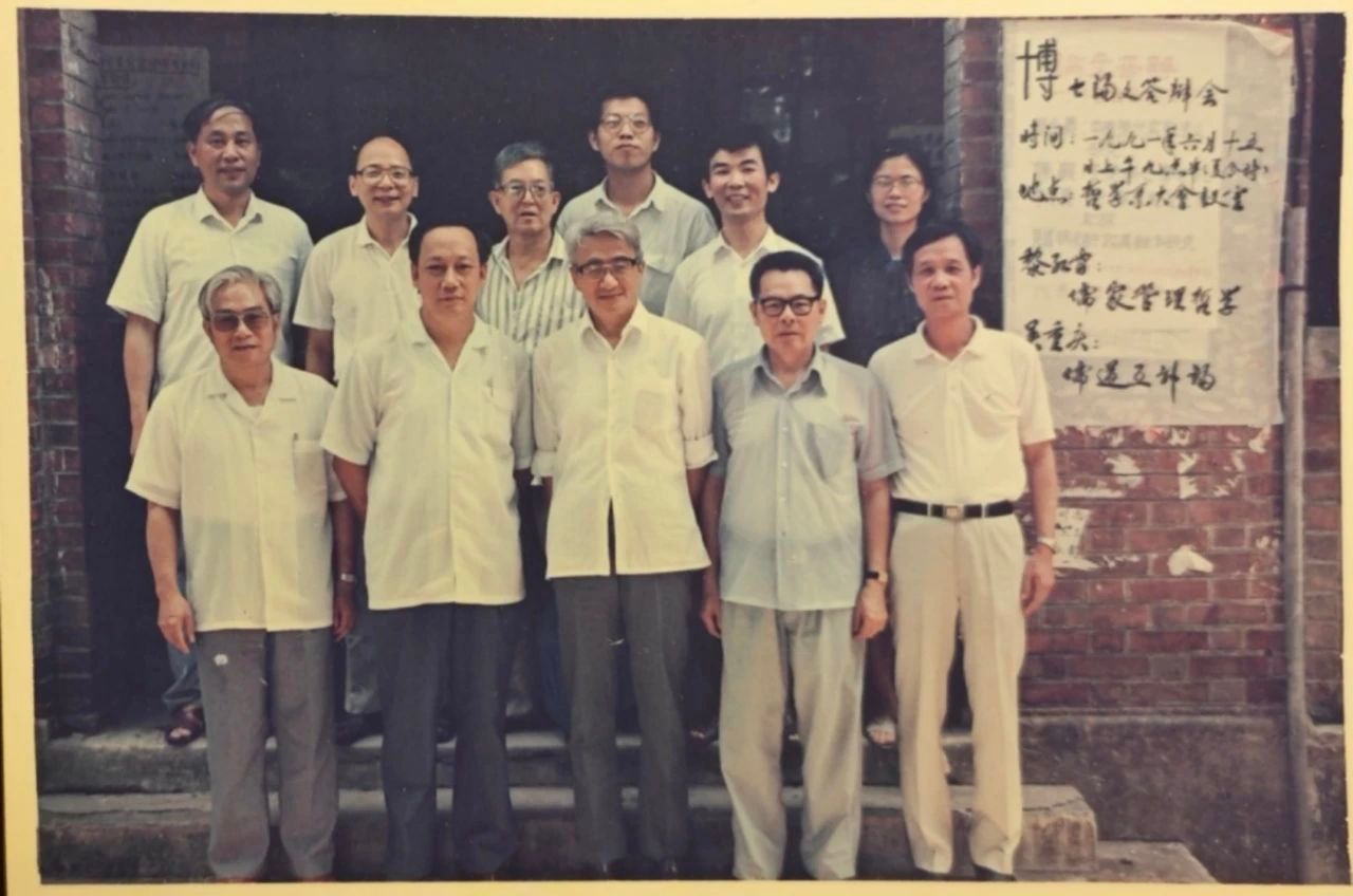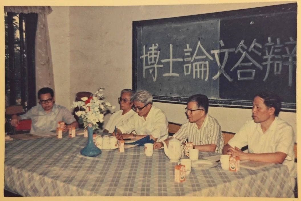 作者博士论文答辩会,从左到右分别为李锦全教授、曹础基教授、萧萐父教授(主席)、吴熙钊教授、姜伯勤教授(1991年6月15日)