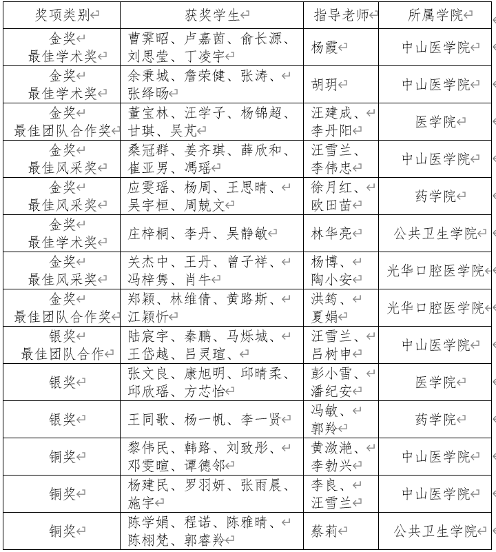 我校医学部各学院学生在指导老师的悉心指导下,历经院内培训、校内选拔赛、复赛前集训、总决赛前模拟训练等环节,最终凭借严谨的态度、扎实的功底、自信的风采,在总决赛中勇夺金奖8项、银奖3项、铜奖3项和最佳风采奖3项、最佳团队合作奖3项、最佳学术奖3项,金奖数(不含国际论坛)、金银铜奖总获奖数双双并列全国第一!