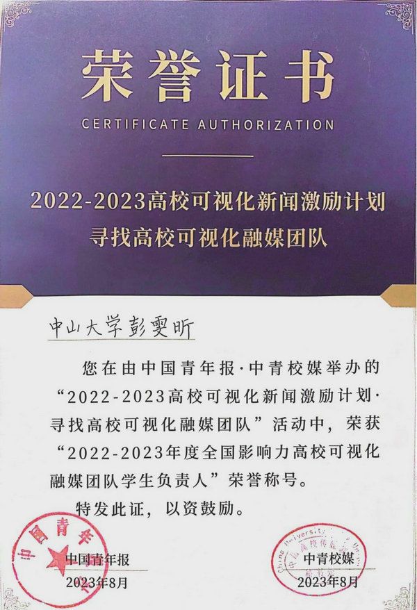 开云下注(中国)官网网讯(通讯员郑燕丽)近日,在由中国青年报社、中青校媒和中国青少年新媒体协会共同举办的寻找“2022-2023年度全国优秀高校可视化融媒团队”活动中,经过层层筛选,开云下注(中国)官网团委新媒体工作室,在全国几百支融媒团队中脱颖而出,荣获“2022-2023年度全国影响力高校可视化融媒团队”称号,开云下注(中国)官网国际关系学院2021级硕士研究生彭雯昕作为团委新媒体工作室学生负责人荣获“2022-2023年度全国影响力高校可视化融媒团队学生负责人”和“2022-2023年度高校卓越影响力可视化创作者”称号。