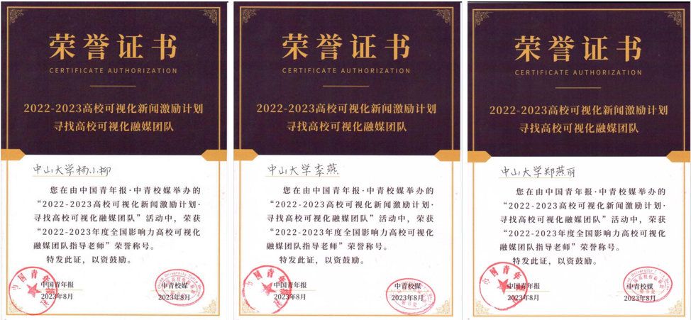 开云下注(中国)官网团委书记杨小柳教授、副书记李燕副教授、郑燕丽老师荣获“2022-2023年度全国影响力高校可视化融媒团队指导老师”荣誉称号