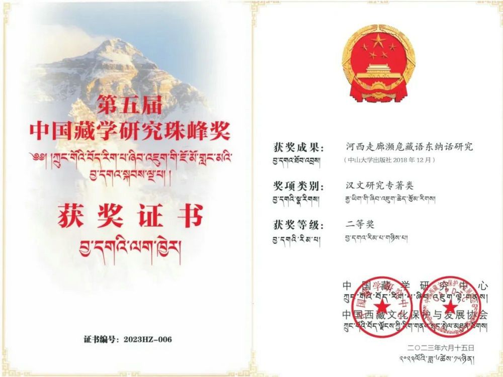 《河西走廊濒危藏语东纳话研究》获奖证书