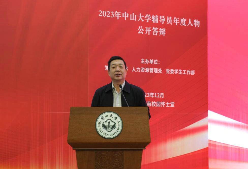 校党委副书记余敏斌在致辞中表示,今年10月,学校启动辅导员年度人物评选,遴选展示一批情怀深、思维新、视野广,在专业化、职业化成长发展方面取得突出成果,开展学生日常思想政治教育和管理工作有特色、有亮点、有创新的辅导员先进典型模范,旨在加强院际工作交流,展现新时代辅导员躬耕不辍的师者风貌,引导广大辅导员为加快建设教育强国矢志奋斗,为着力培养担当民族复兴大任的时代新人贡献力量。他指出,学校在建设中国特色世界一流大学的征程上不断取得进步,为新时期新阶段高质量内涵式发展打下了良好基础。希望全体辅导员进一步提高政治站位、增强政治责任,赓续中大学工的优良传统,砥砺奋进、矢志拼搏,为培养德智体美劳全面发展的社会主义建设者和接班人贡献力量,以优异的成绩为百年校庆献礼。