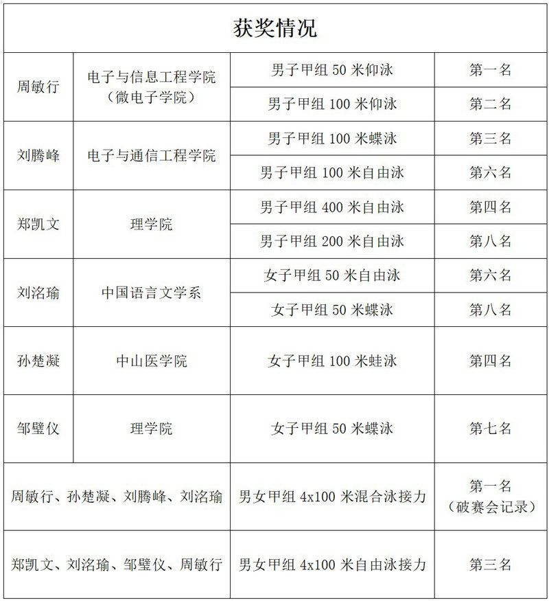 我校高水平组的运动员顶住了一个月中连续参加多项赛事的疲劳,勇于争先,最终斩获4金1银4铜的优异成绩,并且打破单项赛会记录;阳光组游泳队则由来自三校区五校园对游泳怀抱着热爱与信念的同学组成,队员们在此次比赛中劈波斩浪,夺得2金1银2铜,并在接力项目中打破赛会记录,充分展现了中大学子朝气蓬勃的精神风貌。