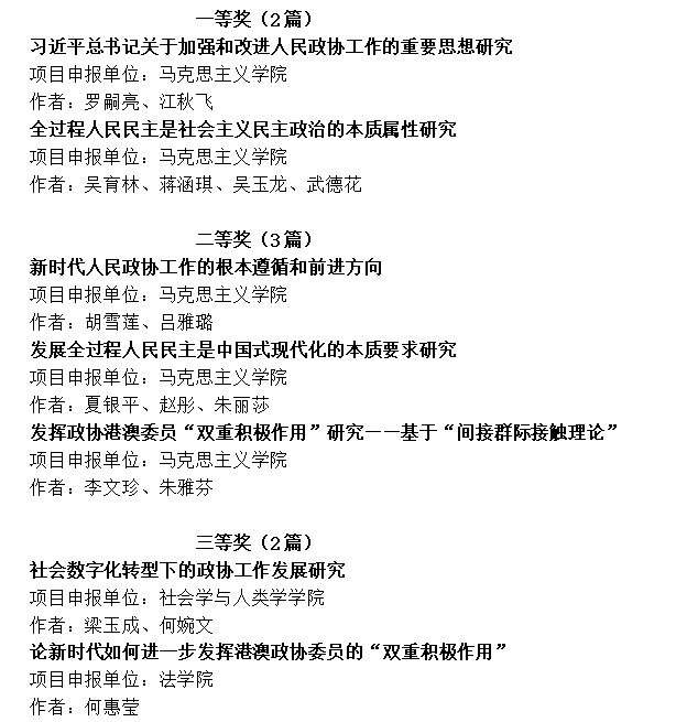 为深入学习贯彻党的二十大精神,深化发展全过程人民民主和人民政协理论研究,更好发挥人民政协专门协商机构作用,2023年省政协理论研究会开展主题征文活动。我校研究基地面向全校征集研究课题,设立课题11项,专家学者坚持以习近平新时代中国特色社会主义思想为指导, 坚持理论联系实际, 紧盯时代之问、 实践所需, 注重对我省各级政协的履职实践进行总结提炼, 7篇论文在主题研讨征文活动中获奖,其中一等奖2篇,二等奖3篇,三等奖2篇。