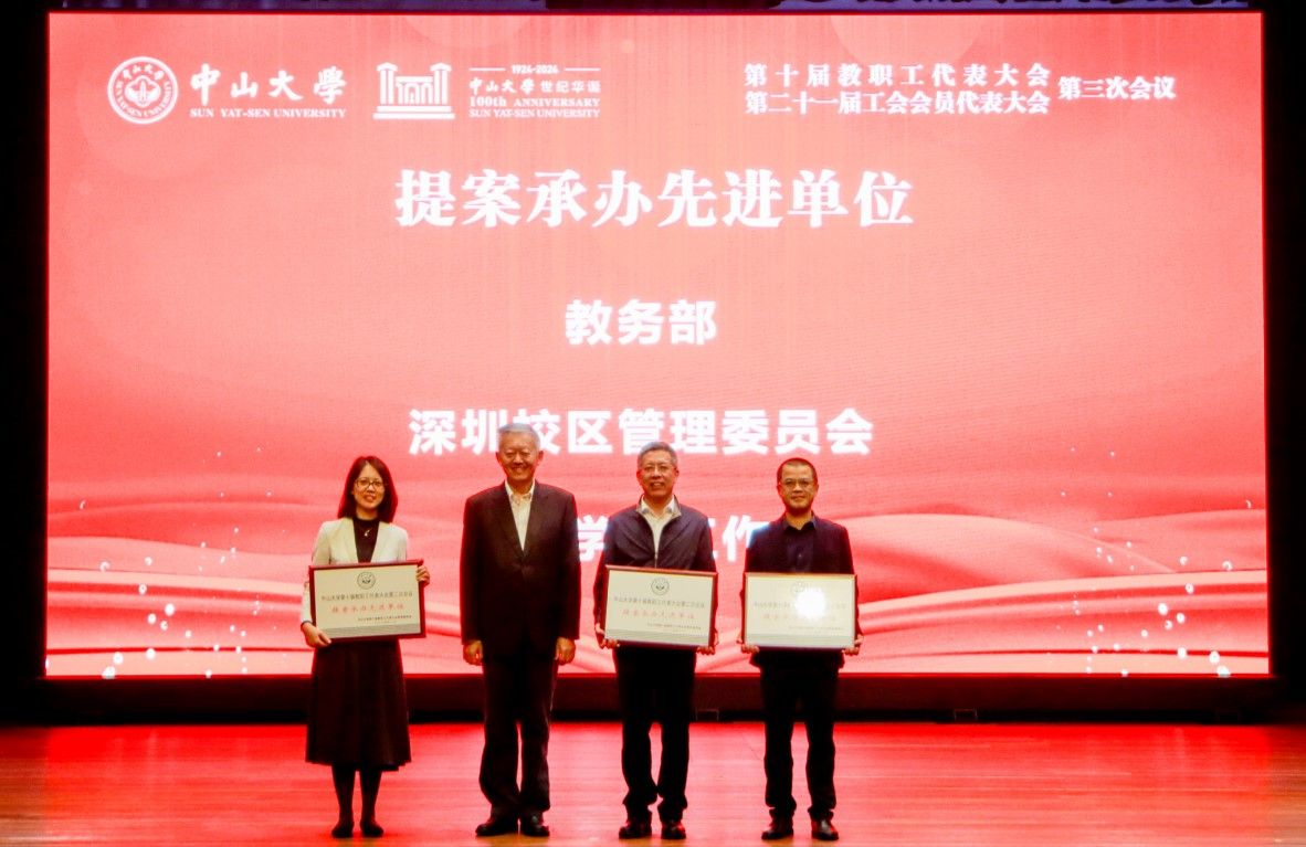 陈春声书记为荣获十届二次教代会“提案承办先进单位”教务部、深圳校区管理委员会、党委学生工作部代表颁发奖牌(党委宣传部 肖遥 摄)