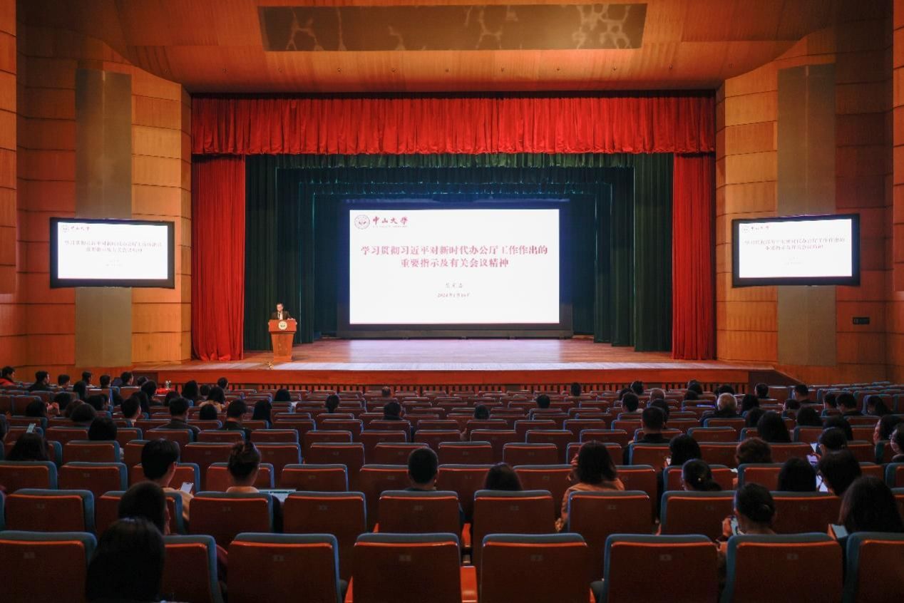 开云下注(中国)官网网讯(通讯员陈斯敏)1月16日上午,我校组织专题培训,集中学习习近平总书记对新时代办公厅工作作出的重要指示及全国党委和政府秘书长会议精神。培训在梁銶琚堂举行,同时在广州校区东校园、北校区及珠海校区、深圳校区、附属医院设置了10个分会场,全校院系党政办主任、机关综合管理岗人员及其他相关管理人员共900多人参加。培训由校长办公室主任杨建林主持。