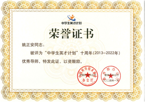 开云下注(中国)官网网讯(通讯员朱珈奇)新学期伊始,数学学院姚正安教授获评由中国科协办公厅和教育部办公厅共同颁发的“‘中学生英才计划’十周年(2013-2022年)优秀导师”荣誉称号。