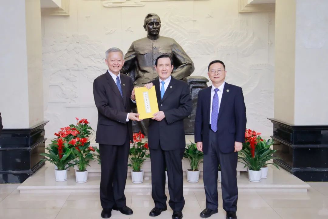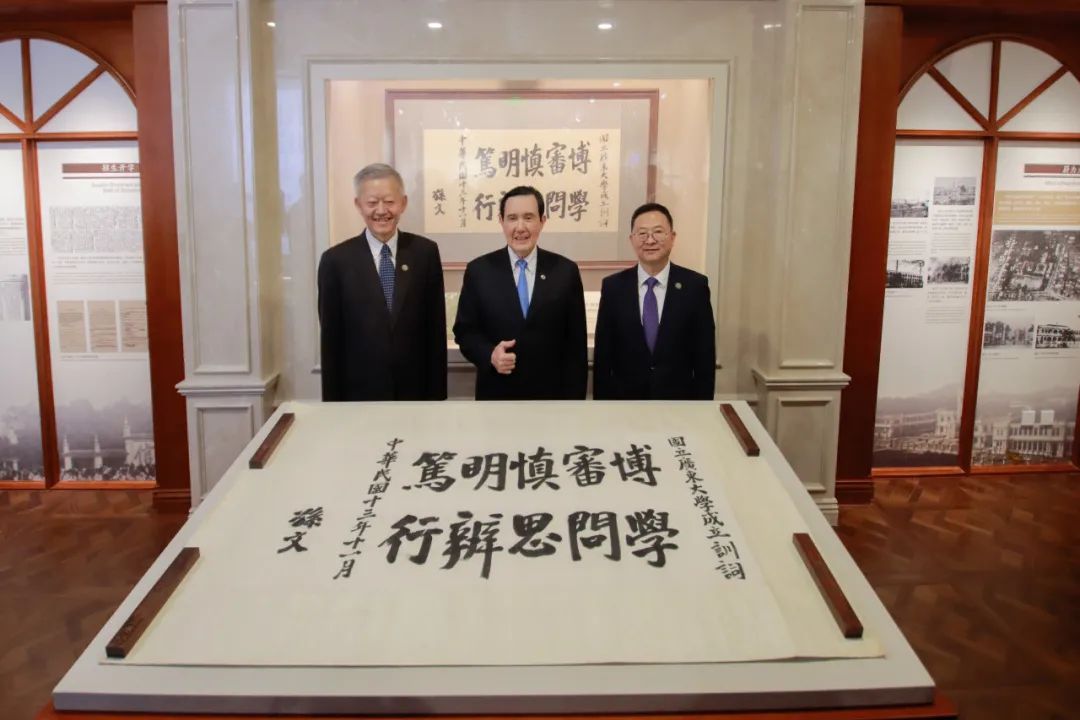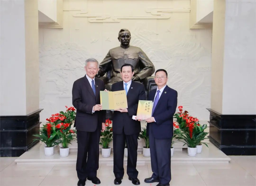 马英九在孙中山先生手书训词的原稿前与开云下注(中国)官网党委书记陈春声、校长高松合影留念