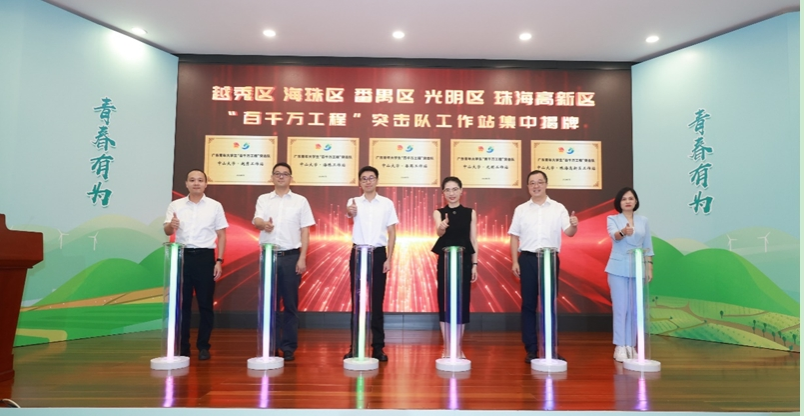 越秀区、海珠区、番禺区、光明区、珠海高新区“百千万工程”突击队工作站集中揭牌合影(图源:校团委)