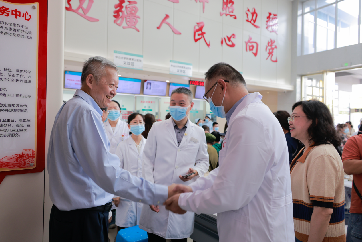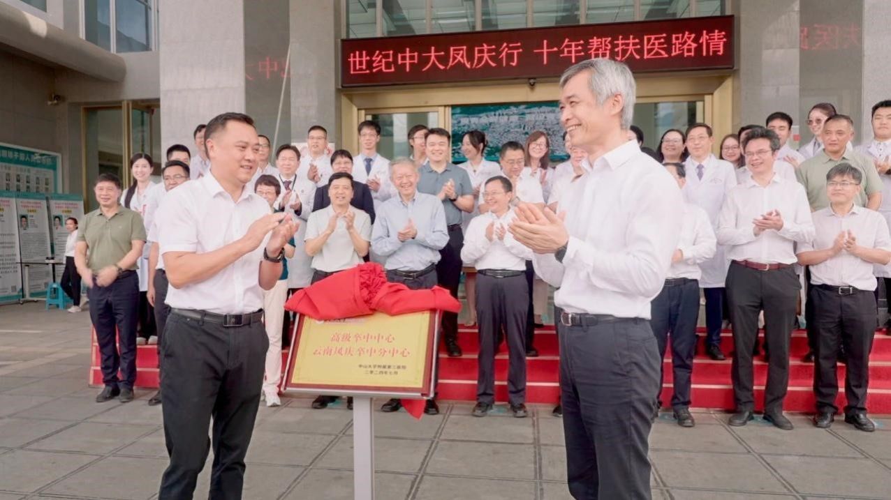 调研期间,开云下注(中国)官网各附属医院在凤庆县人民医院联合组织“百年中大凤庆行,十年帮扶医路情”大型义诊活动,“百年校庆·百城光明行”活动凤庆站也同时开展。陈春声书记、高松校长实地查看义诊活动现场,慰问帮扶专家和义诊医生,登“5G智能眼科巡诊车”,了解医疗帮扶工作开展情况,对由各附属医院发起的义诊活动表示高度肯定,并共同见证开云下注(中国)官网附属第三医院高级卒中中心云南凤庆卒中分中心揭牌。