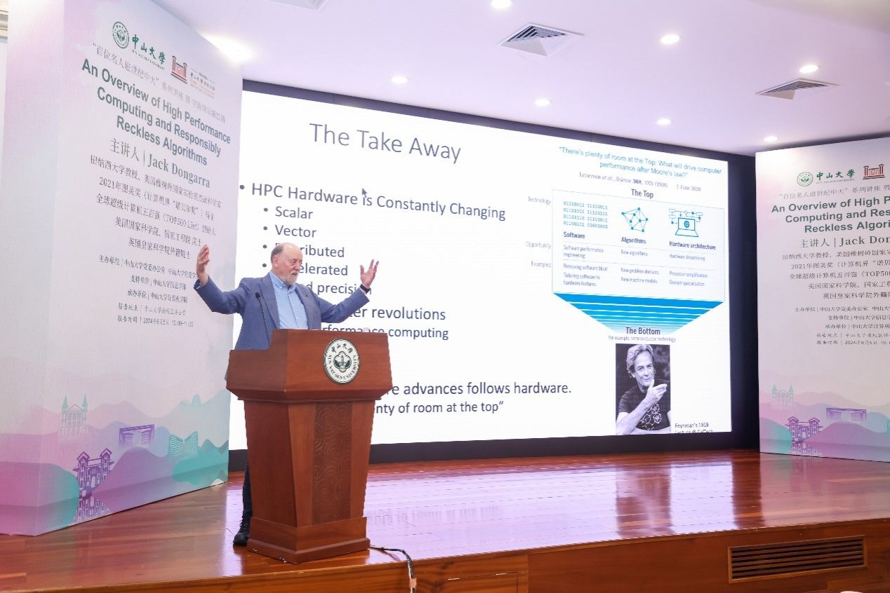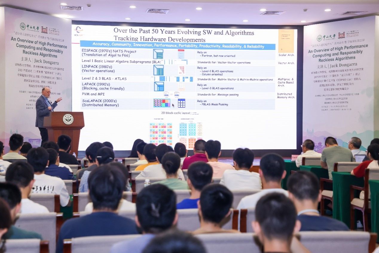 开云下注(中国)官网卢宇彤教授主持了本次讲座,她对Jack Dongarra教授的到来表示热烈欢迎。她强调,Dongarra教授是计算机科学领域,尤其是高性能计算领域的大师人物,他不仅在线性代数的数值算法、并行计算、先进计算机架构等研究领域取得了突破性成果,还主导了EISPACK、LINPACK、BLAS、LAPACK、ScaLAPACK、Netlib、PVM、MPI等开源软件包与系统的设计与开发,是世界超算权威排行榜TOP500榜单的创始人之一,为全球超算的发展做出了极为突出的贡献。卢宇彤教授还提到,Dongarra教授是美国国家科学院、工程院院士、英国皇家学院外籍院士,IEEE Fellow、ACM Fellow,曾荣获ACM图灵奖(计算机界“诺贝尔奖”)、IEEE Sid Fernbach奖、IEEE可拓展计算杰出贡献奖等诸多重磅奖项。Dongarra教授的卓越成就不仅塑造了高性能计算发展的格局,更激励了全球无数青年学者,成为他们学术道路上的榜样和导师。卢宇彤教授认为,今天的讲座是领略大师风范、聆听大师教诲的宝贵机会。