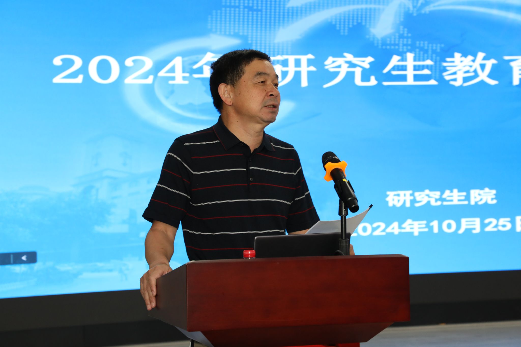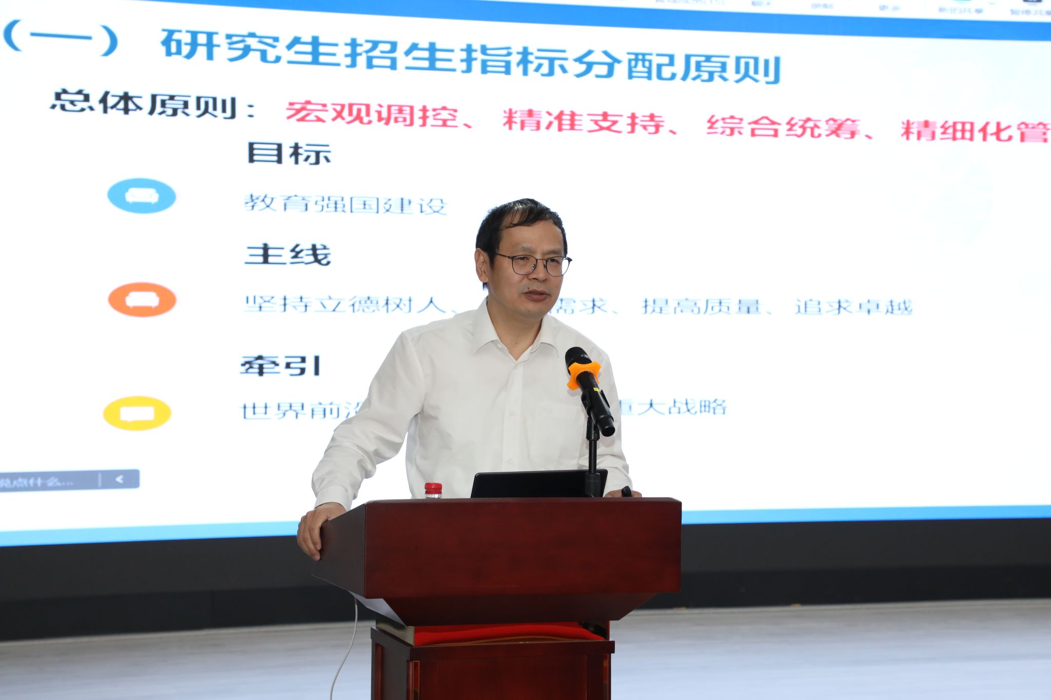 会上,刘济科副校长以深入学习贯彻习近平总书记关于教育的重要论述和全国教育大会精神,推动研究生教育高质量发展为主线,就进一步做好2025年研究生招生整体工作,以修订研究生培养方案、做好学位点周期性合格评估等工作为契机,建立健全学位点质量保证体系,以及认真开展学位论文抽检并科学应用抽检结果等内容,进行了具体部署。他强调,要进一步提高站位,统一认识,汇聚合力,认真贯彻落实立德树人根本任务,坚持以学生成长成才为中心,压实职能部门与培养单位、导师的育人责任,严格规范地把好“入口关、过程关和出口关”,切实做好研究生教育各项工作。刘济科副校长还代表学校对各培养单位为学校研究生教育工作的付出与贡献表示了感谢。