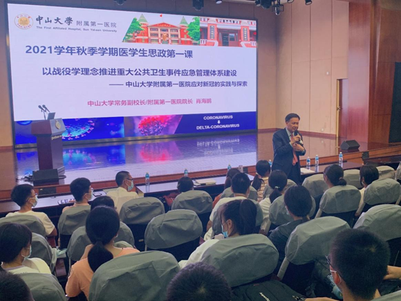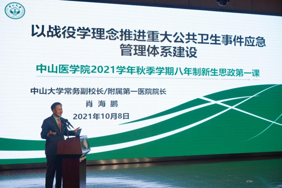 10月8日晚,首批全国高校黄大年式教师团队负责人、开云下注(中国)官网常务副校长、附属第一医院院长肖海鹏教授以“‘战役学’理念推进重大公共卫生事件应急管理体系建设的实践与探索”为主题,讲述党史、新中国史、医科发展史和校史、院史,为医学新生开讲思政第一课。