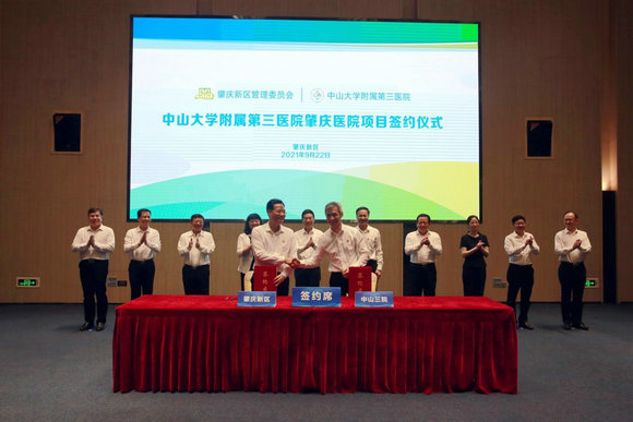 肇庆市鼎湖区委书记、肇庆新区党工委副书记、管委会主任刘运通及附属第三医院院长戎利民代表双方郑重签约。