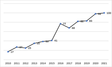 2010-2021年QS100升学人数不断攀升(来源:国际金融学院)