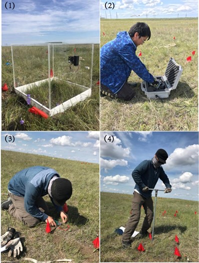 (1)用于13C标记的透明封闭气室,(2)用于监测土壤水分和温度的CR10X记录仪,